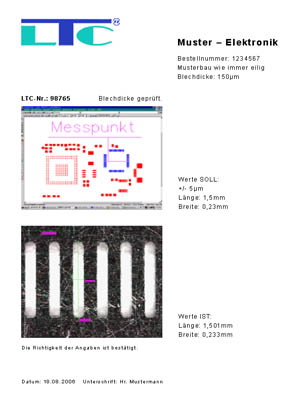 Was man schwarz auf weiß besitzt... Auf Wunsch erhalten Sie für Ihre SMD-Pasten- oder Kleberschablone natürlich ein ausführliches Messprotokoll, in dem wir definierte Präzisionsschnitte detailliert dokumentieren. Wir lassen uns von Ihnen gerne daran messen!
